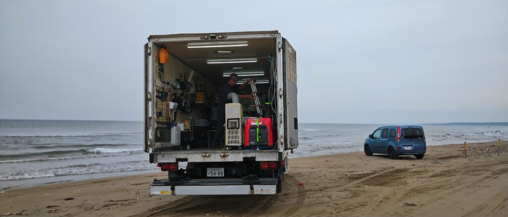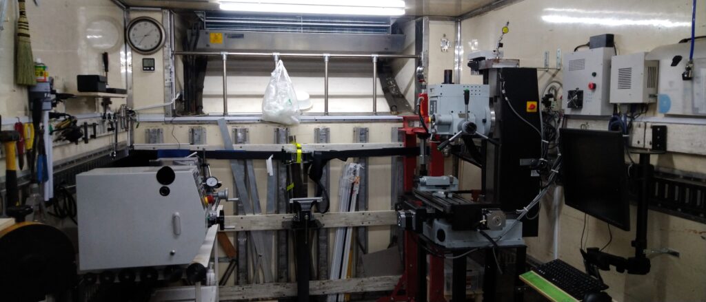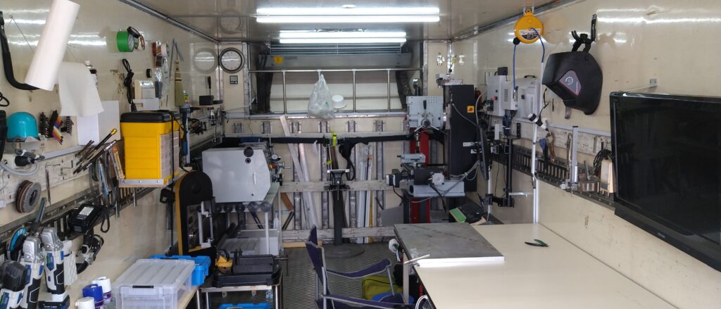 4トンロングトラックの荷室を工作室にカスタマイズし、NCフライス盤や旋盤、溶接機器、発電機を積み込み、トラック内で加工できるようになりました。